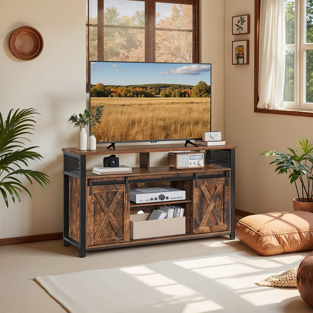 Entertainment Center, Media Console Table with Sliding Barn Doors, for Living Room, Brown and Black