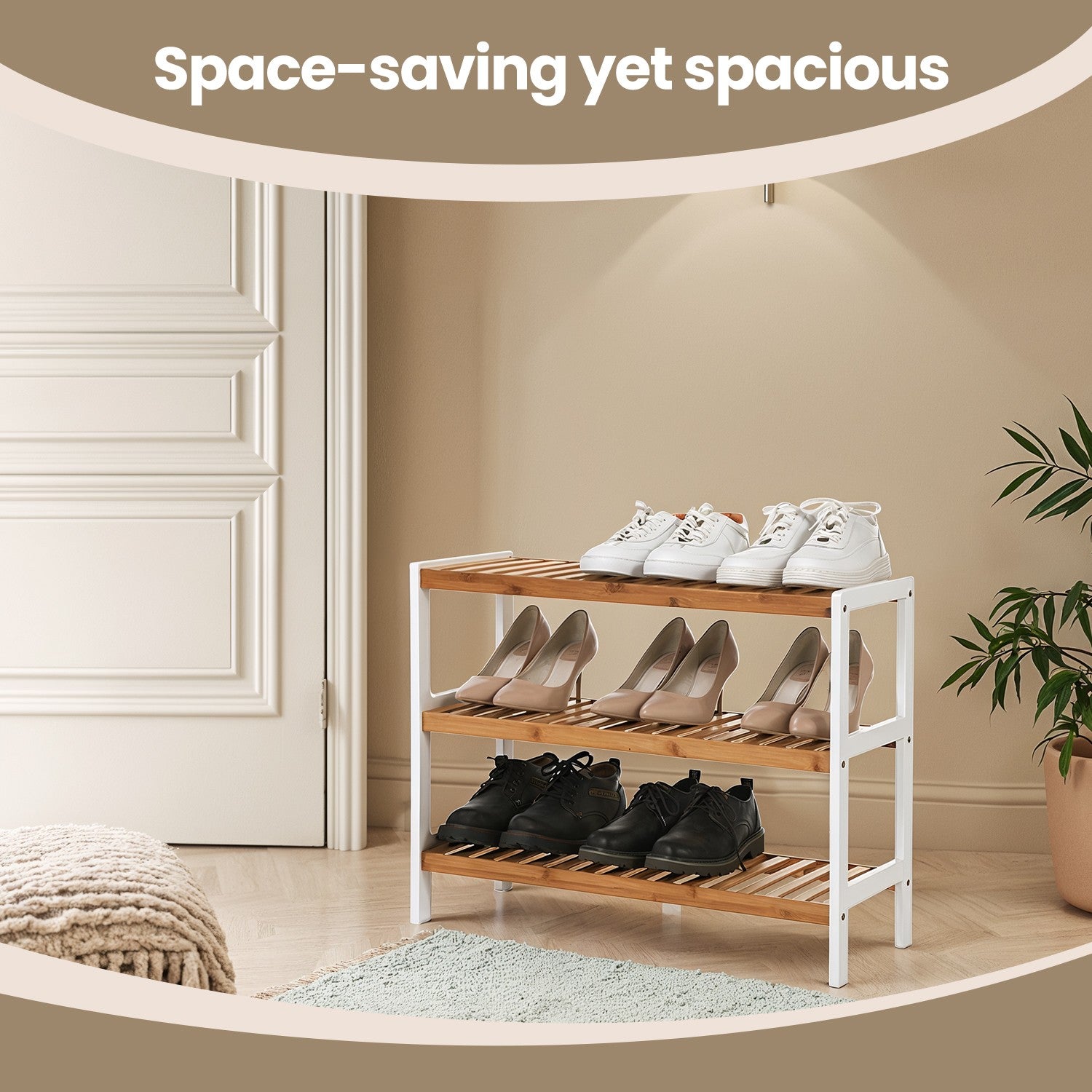 Natural Bamboo 3-Tier Shoe Rack, Shelf for Shoes Plants Books