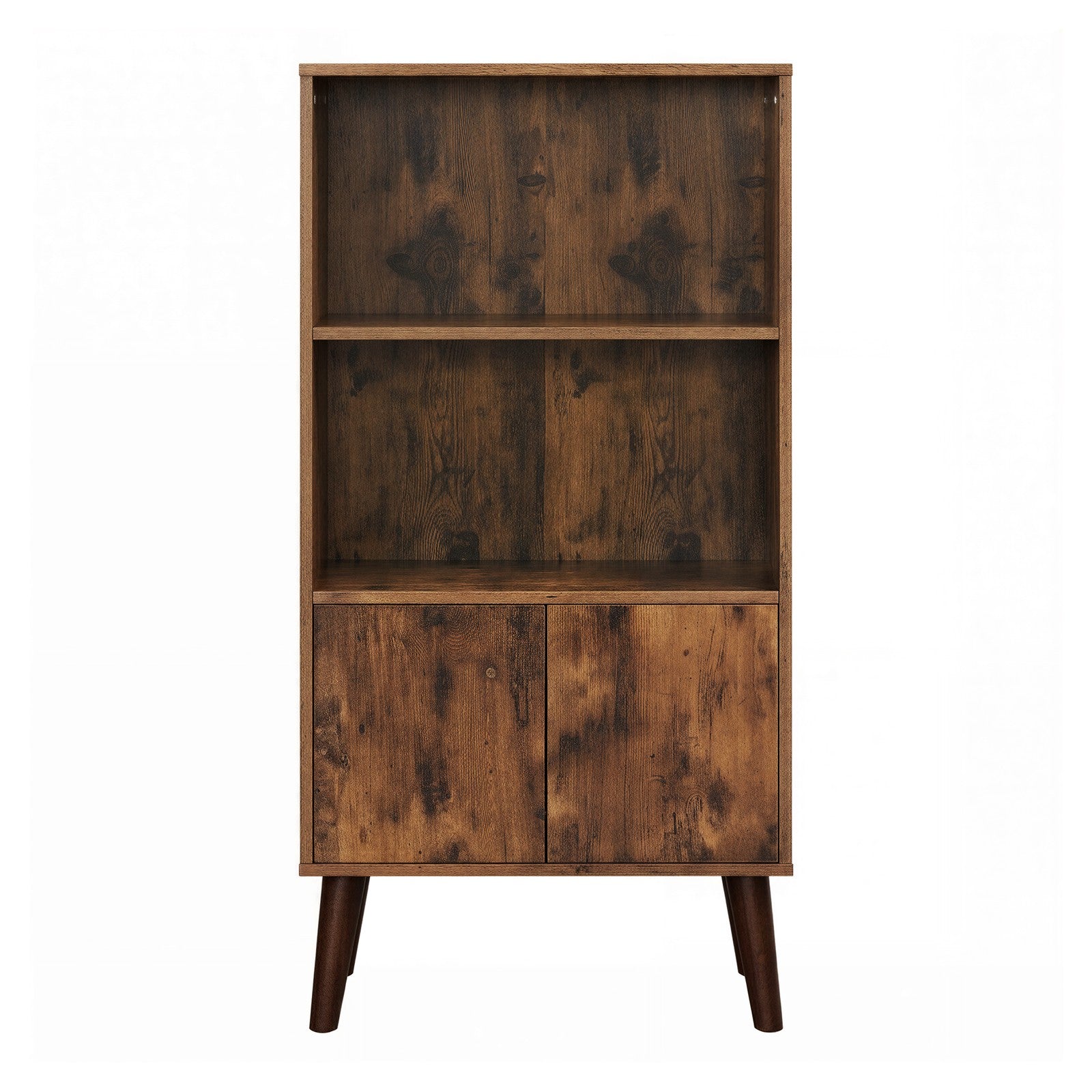 Rustic 3-Tier Storage Shelf with Cabinet Doors, Mid-Century Modern Bookcase for Living Room & Home Office