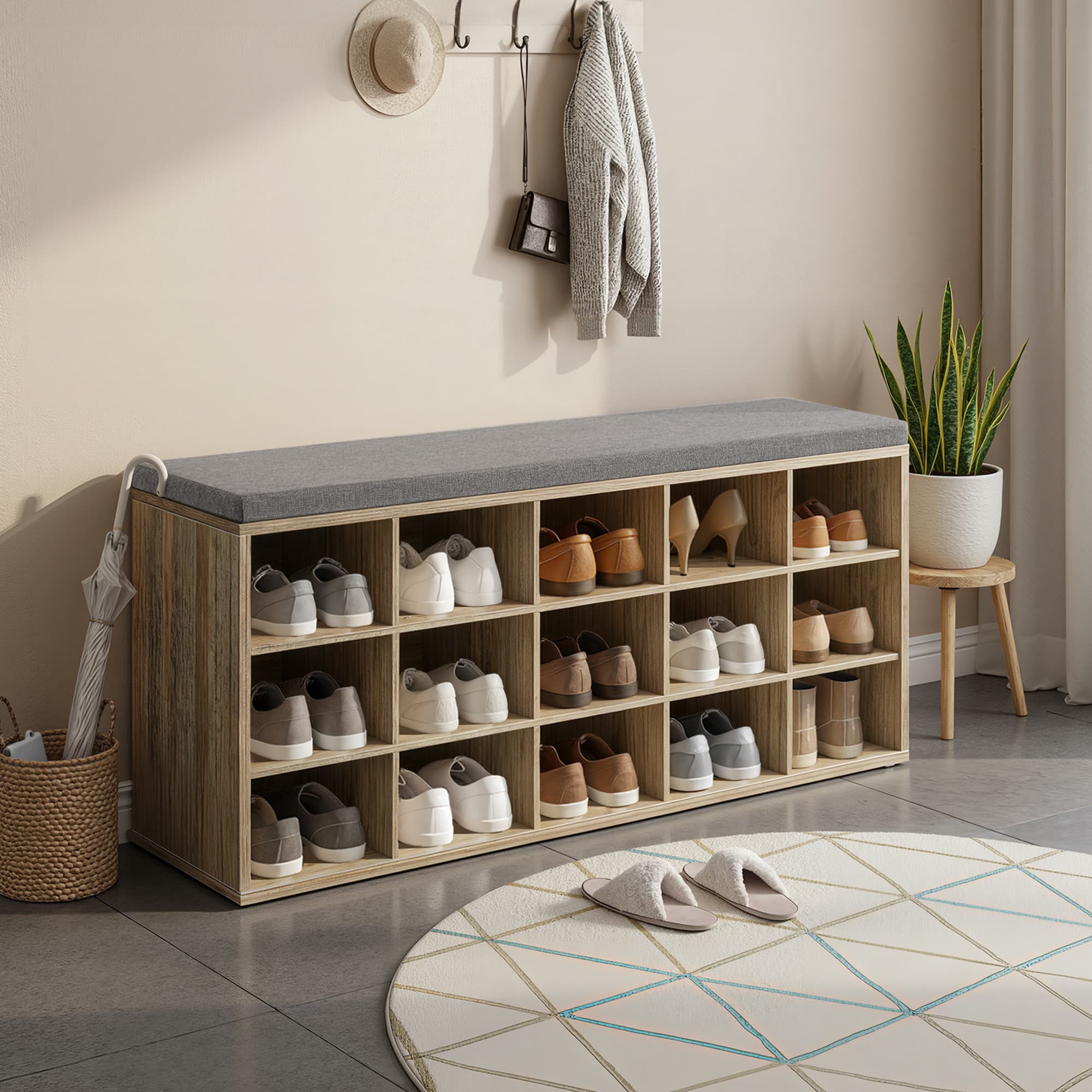 VASAGLE Shoe Bench, Storage Bench with Padded Seat, 15 Compartments