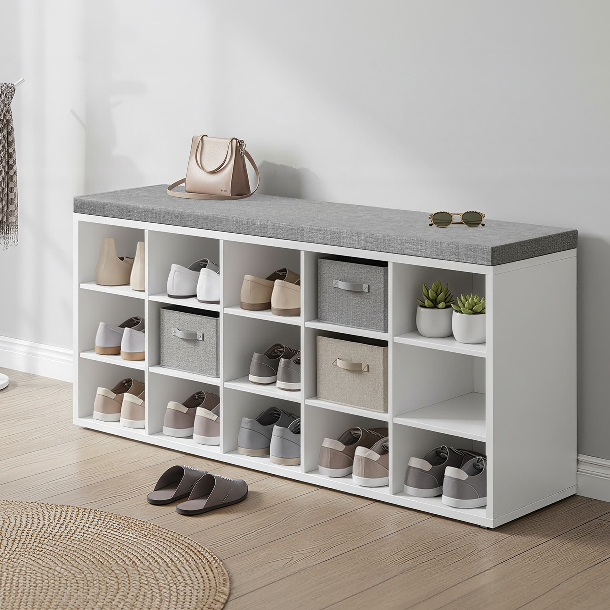 Entryway Storage Bench with 15 Compartments, Upholstered Shoe Organiser for Bedroom, White and Grey