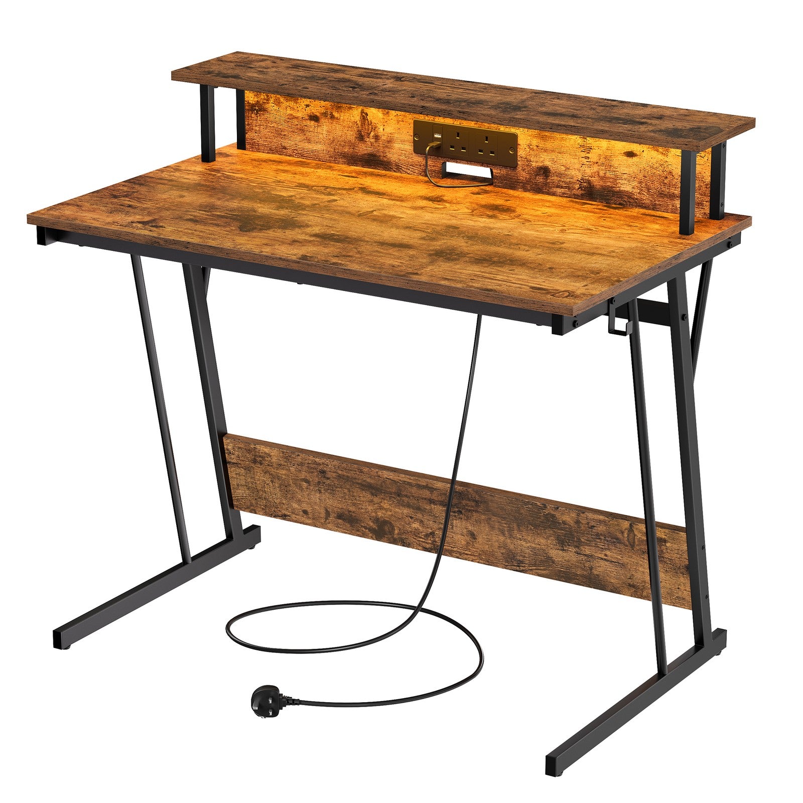 Computer Desk with LED Lights, Built-In Power Outlets, Monitor Shelf