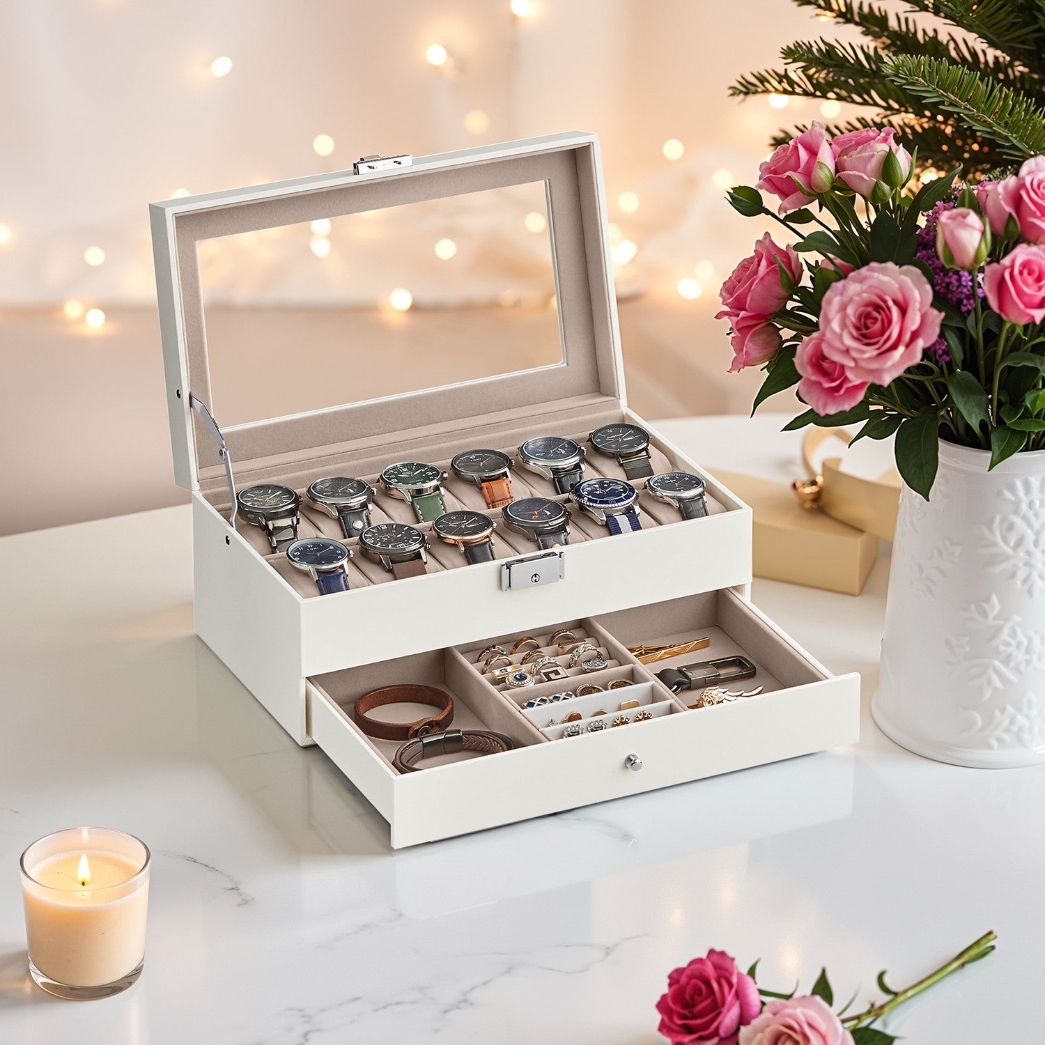 12-Slot Watch Box, Lockable Watch Case with Glass Lid, Drawer
