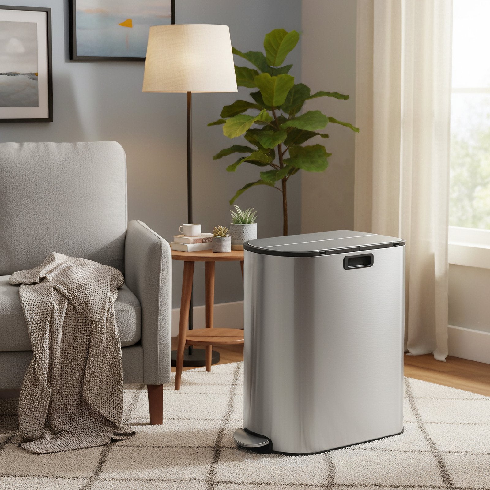 Recycling Pedal Bin, 2-Section Slim Kitchen Waste Bin, Butterfly Lids, White and Silver