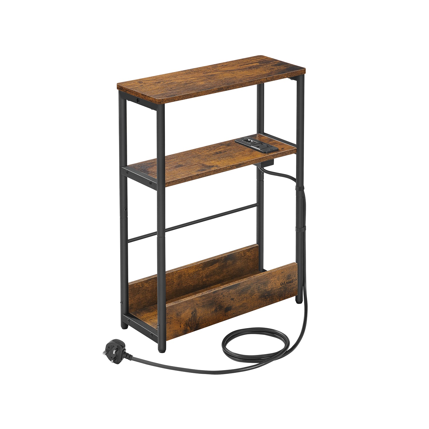 3-Tier Slim Side Table with Charging Station Rustic Brown and Ink Black